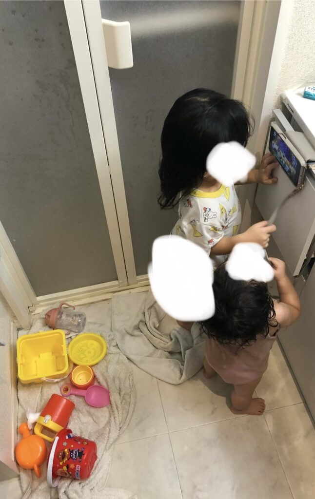 - ドア半開きで様子を見ながら上の子と自分を洗う